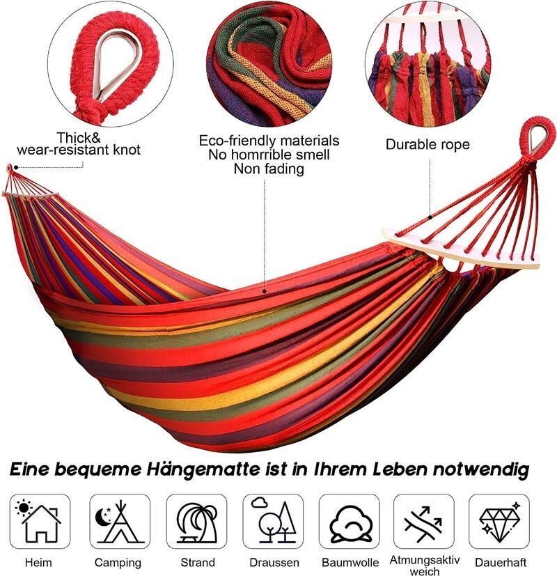 *Yüksek kaliteli çift hamak: Pamuklu kanvastan yapılmış, 200 kg’a kadar yük kapasiteli, iki yetişkinin konaklayabileceği kamp hamakımız. Hamak ekran boyutu: 190*80 CM. Hamak, 8,5-10 fit (2.6-3 mt) uzunluğundaki hamak çerçeveleri veya hamak ağaçları için kullanılabilir.